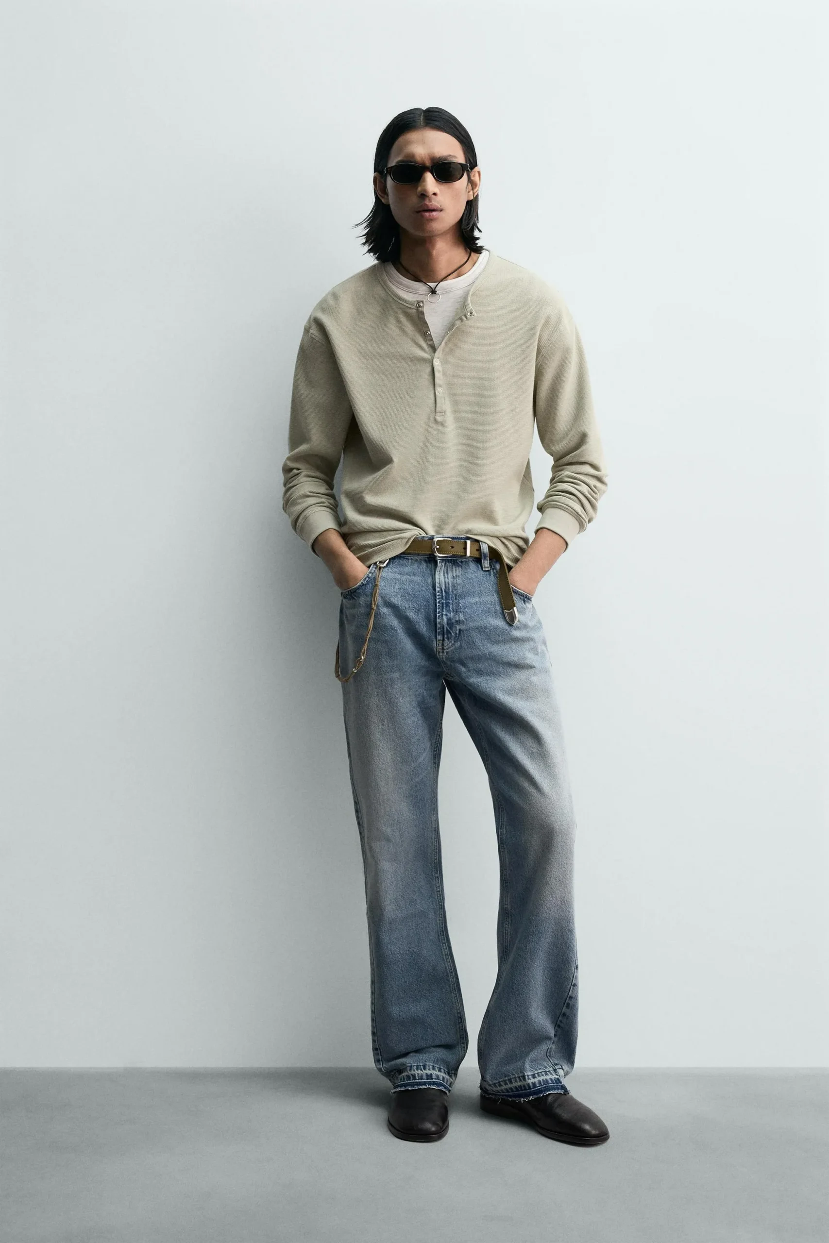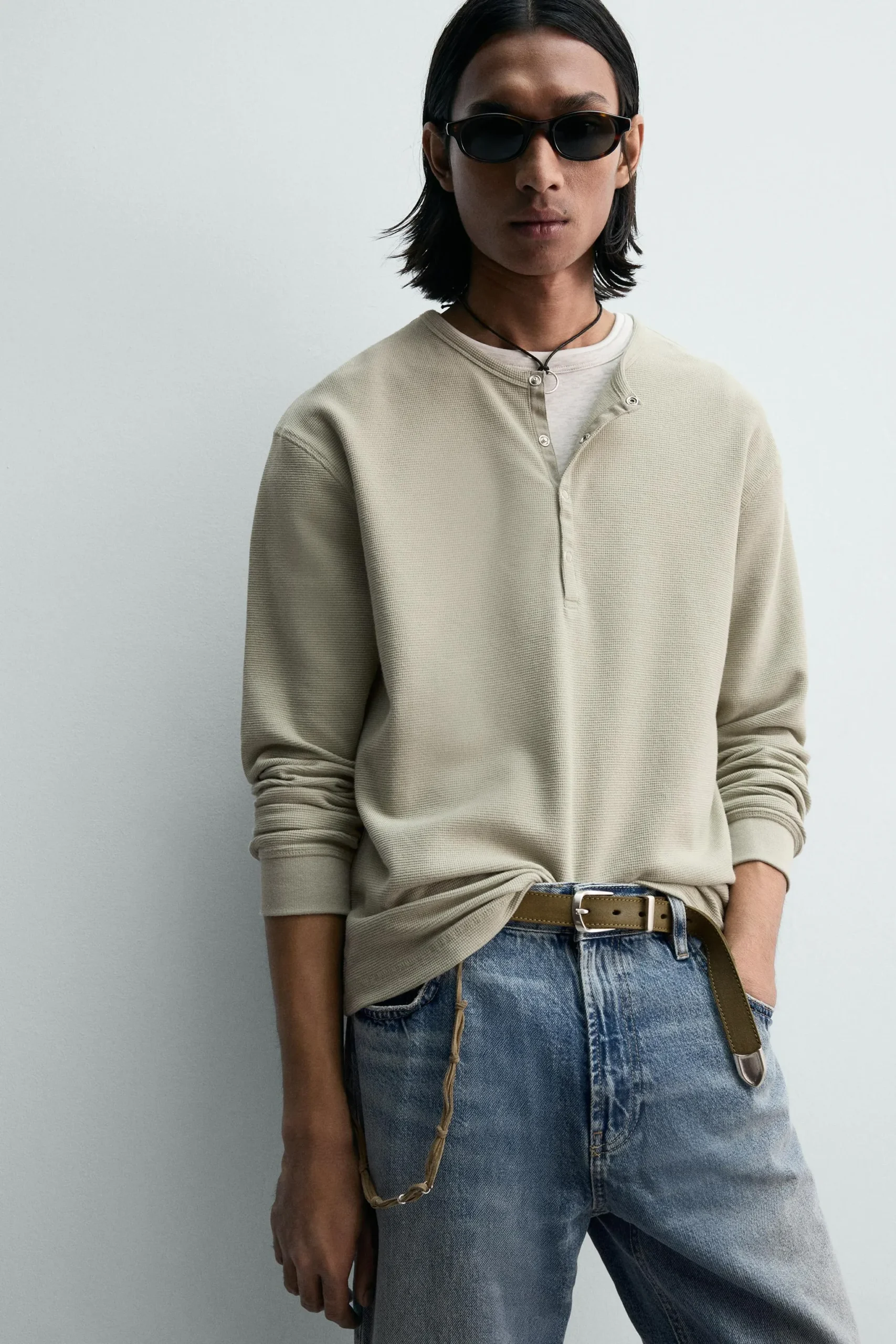 T-shirt slim fit yang terbuat dari kain dengan struktur wafel. Kerah bulat dengan penutup kancing jepret di bagian depan. Lengan panjang.