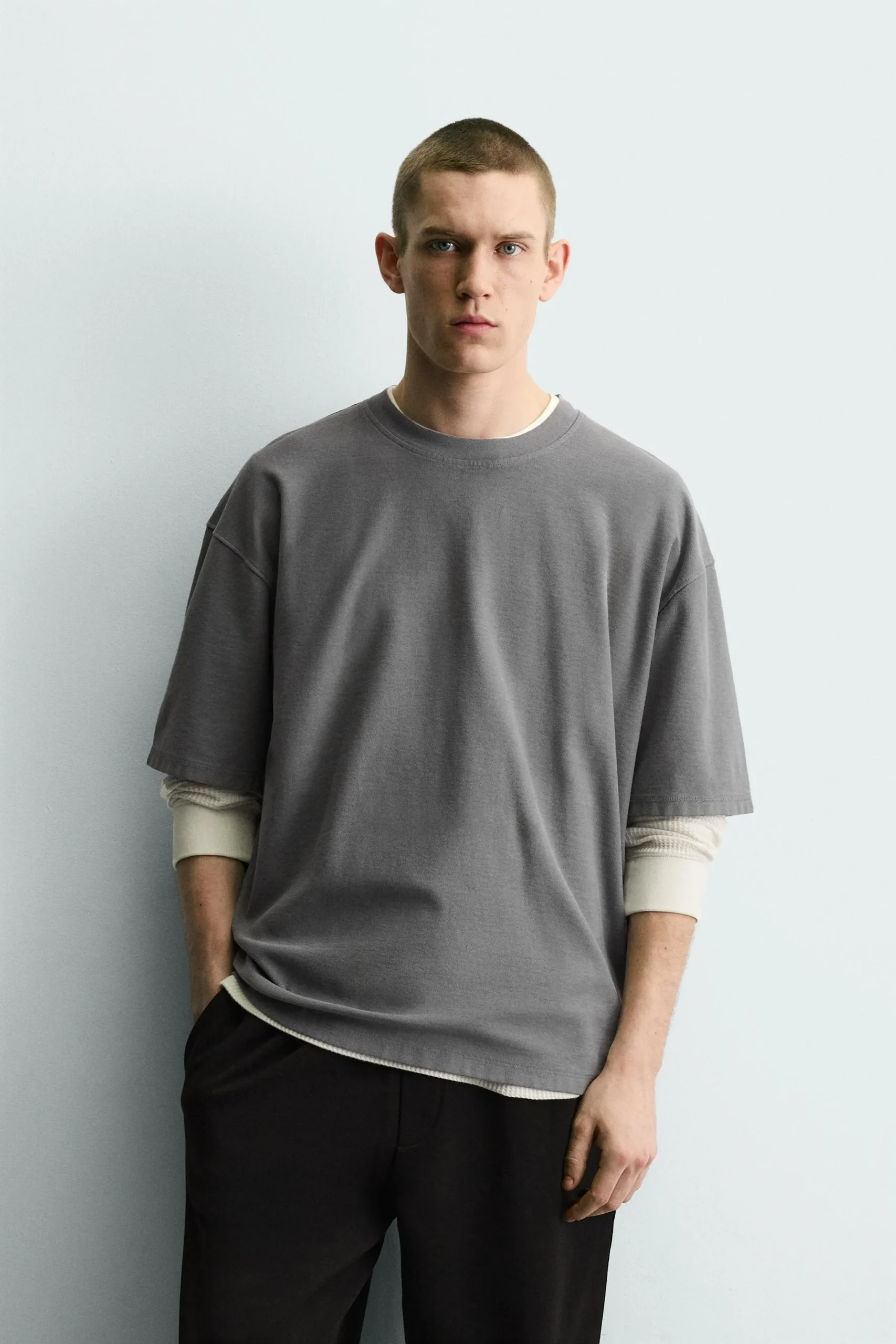 | Description | T-shirt relaxed fit terbuat dari kain katun. Kerah bulat dan lengan pendek. | T-shirt slim fit yang terbuat dari kain dengan struktur wafel. Kerah bulat dengan penutup kancing jepret di bagian depan. Lengan panjang. | |||